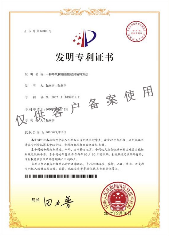 環(huán)氧樹脂阻尼封裝料發(fā)明專利證書