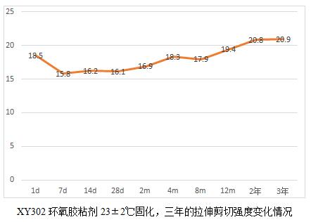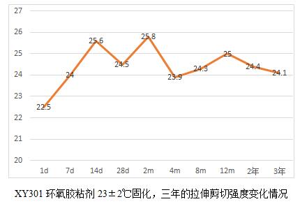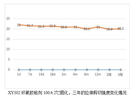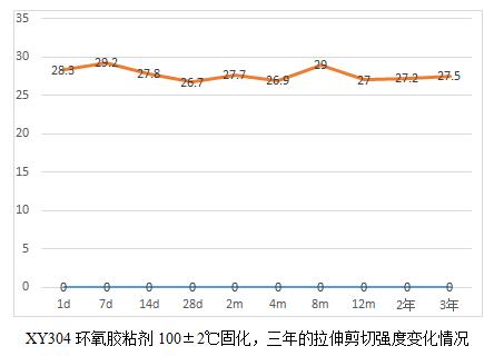 XY304環(huán)氧膠粘劑的耐老化有19.6年的實測數(shù)據(jù)。鑒于現(xiàn)在軍工用膠粘劑品種有新增且部分原材料供貨廠家也發(fā)生了變化,為了真實了解這些材料的耐老化情況,我們將公司的環(huán)氧類型的膠粘劑產(chǎn)品做了一個25年老化的計劃,并于2018年元月開始,預(yù)計整個試驗到2043年結(jié)束。