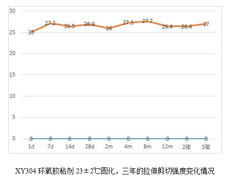 當(dāng)然通過這6個表,我們也能看出規(guī)律就是,膠粘劑產(chǎn)品高溫固化相對較為完全,后續(xù)老化數(shù)據(jù)影響不大,而常溫固化數(shù)據(jù)明顯低于高溫固化,比如XY304,常溫固化數(shù)據(jù)未25兆帕,高溫固化為28.3兆帕,而XY301室溫固化數(shù)據(jù)22.5兆帕,高溫固化為28.2,相比高出25%。